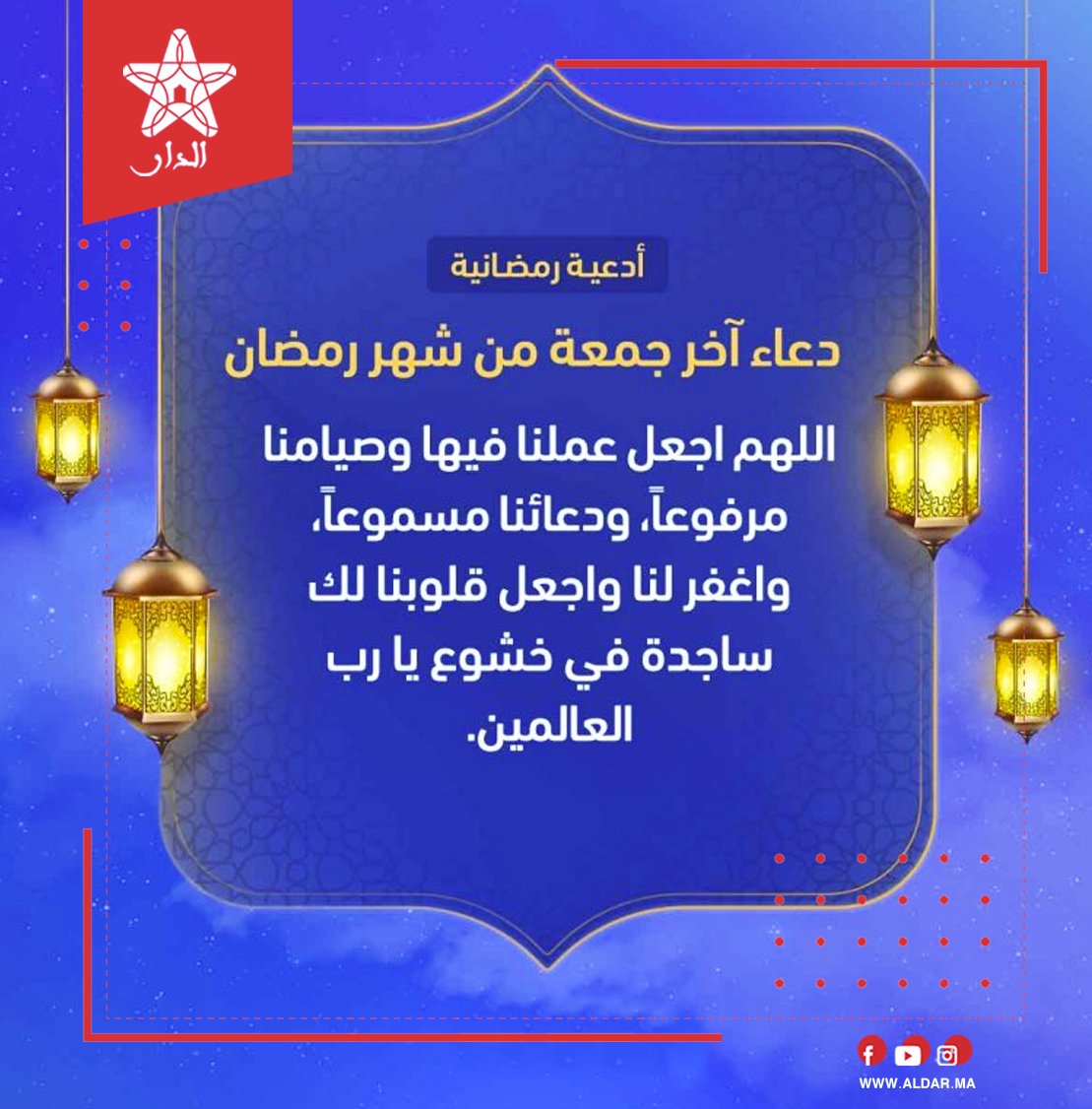 ماذا يطلق على آخر جمعة في رمضان ينتظر المسلمين شهر رمضان المبارك حتى يتوجه به العباد بالدعاء والصلوات الى. لقد منَّ الله على المسلمين وأَنعَمَ عليهم بشهر رمضان المبارك، واختصَّه بفضائلٍ عظيمةٍ ليرفَعَ به درجات عباده المؤمنين. وهذا آخر يوم من شهر رمضان فإذا انقضى فاختمه لنا بالسعادة والرحمة والمغفرة ، والرزق الواسع الكثير الطيب ، الذي لا حساب فيه ولا عذاب عليه ، والبركة والفوز والفوز بالجنة ، والعتق من النار ، ولا تجعله آخر العهد منه ، واهله علينا ، بأفضل الخير والبركة والسرور علي. إلتِقاء يوم الجُمعة مع شهر رمضان الفضِيل يراه المسلمون فُرصة قيمة يجب إنتهازها في الطاعات والعِبادات، فيوم الجمعة هو خير أيام الأسبوع وشهر رمضان هو خير الشُهور ولهذا فإن خير الأيام في خير الشهور هي أيام الجمعة التي تأتي في شهر رمضان، وقد مضت كافة الجُمعات. دعاء الجمعة الماضي في رمضان.